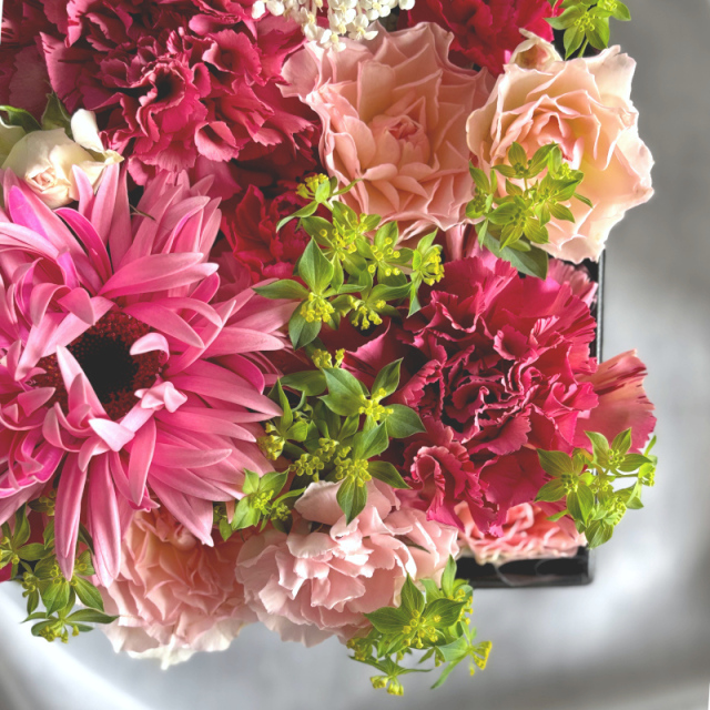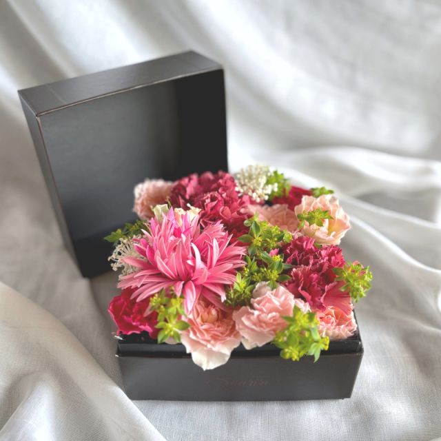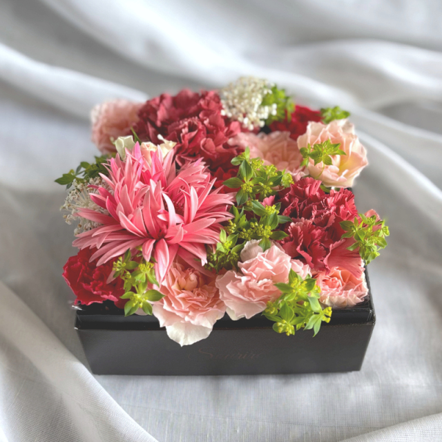 ボックスアレンジメントはボックスの中にぎっしりとみずみずしいお花がいっぱいの生花のアレンジメントです。