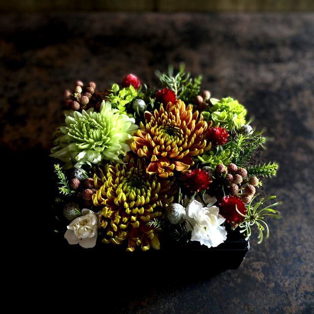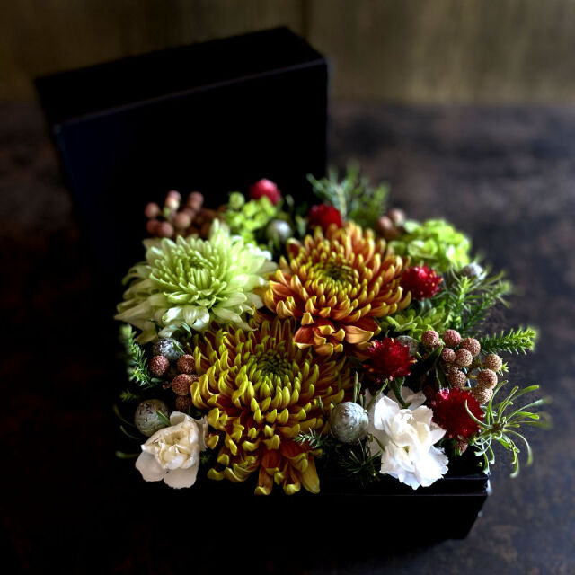 こちらはマムが主役のオレンジとグリーンを基調とした、ボックスフラワーアレンジメントです。