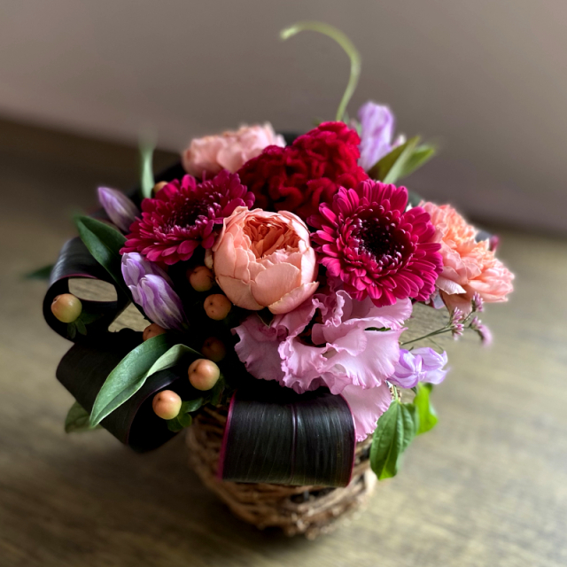 一輪の大きなピンク系の濃淡のお花をコロンとした天然素材のバスケットにまあるく仕上げた、華やかな雰囲気のバスケットアレンジメントです。