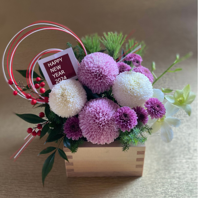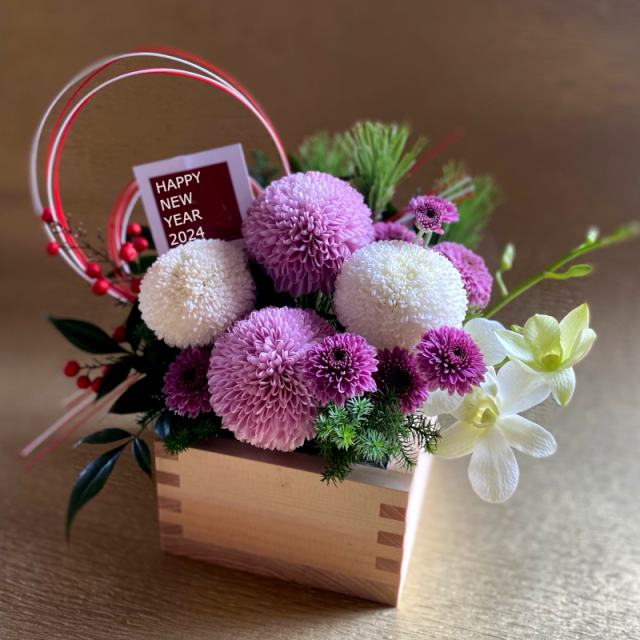 こちらの商品は、その伝統と心躍るワクワクの枡の器に花夢館のこだわりのお正月を彩る縁起物花材を生けこんだフラワーアレンジメントです。