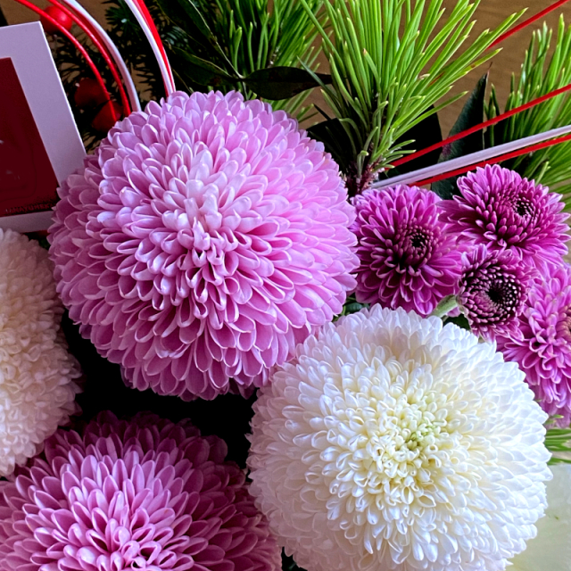 - マムを中心にお正月の雰囲気に合うその時の最良のお花で『紅梅』色のイメージでおつくりします。