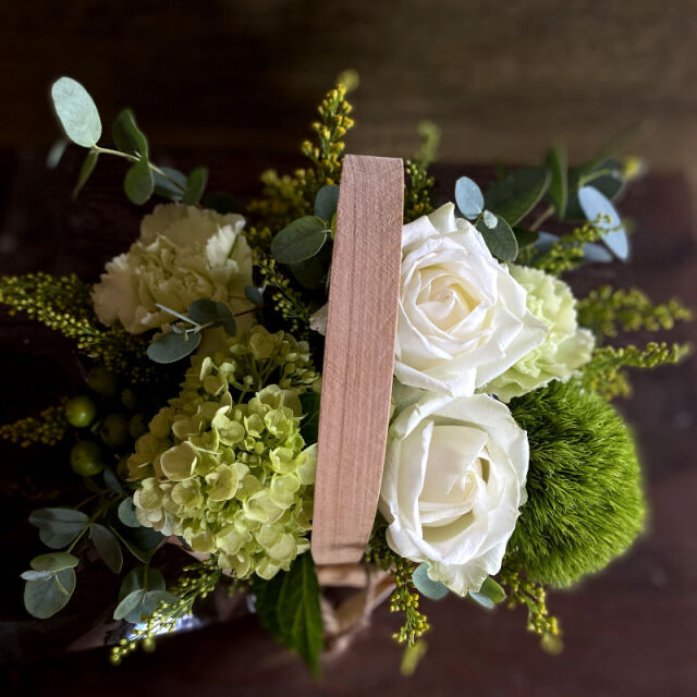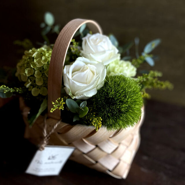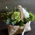 ホワイトとグリーンのお花を使った、爽やか大人ナチュラルな雰囲気のバスケットタイプのアレンジメントです。