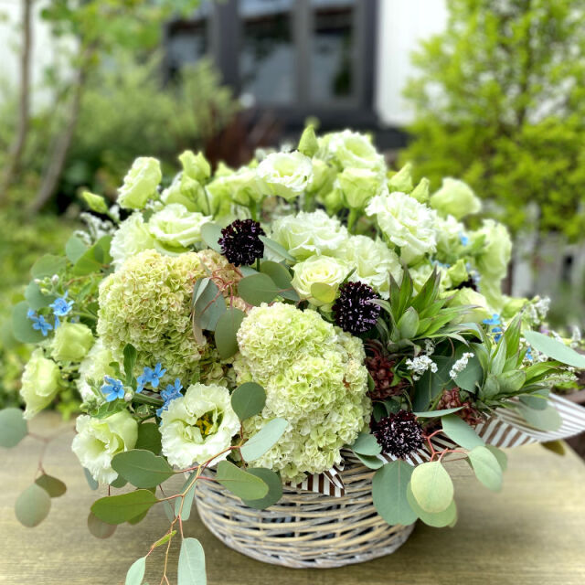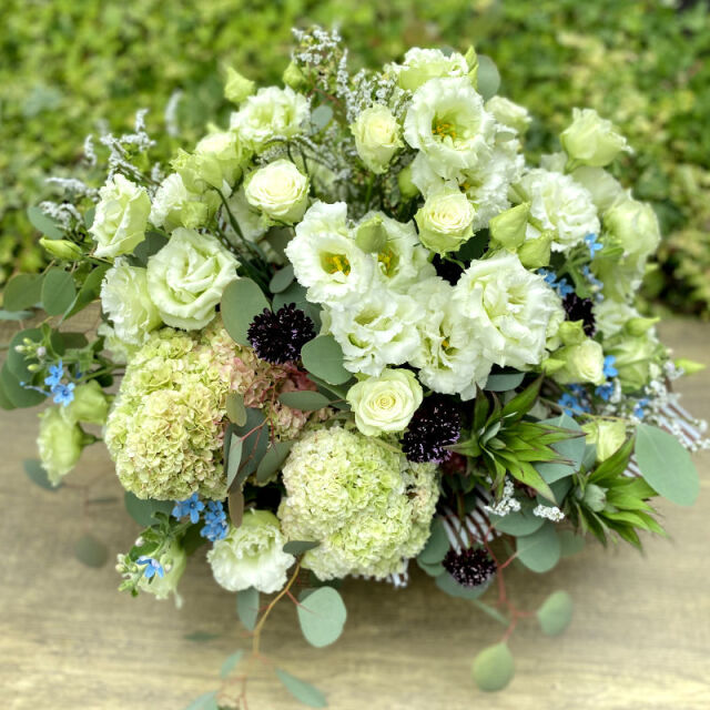 ホワイトとグリーンのお花を使った、爽やか大人ナチュラルな雰囲気のアレンジメントです。