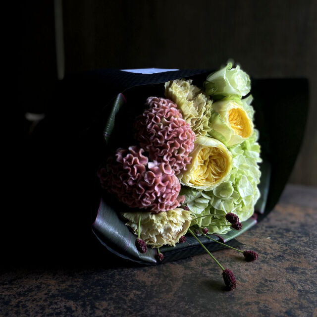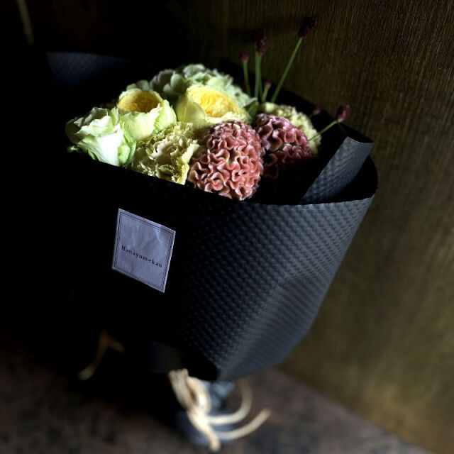 淡いイエロー系やニュアンスカラーのお花で大人っぽくラッピングした花束です。