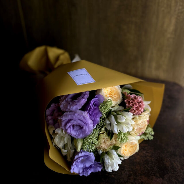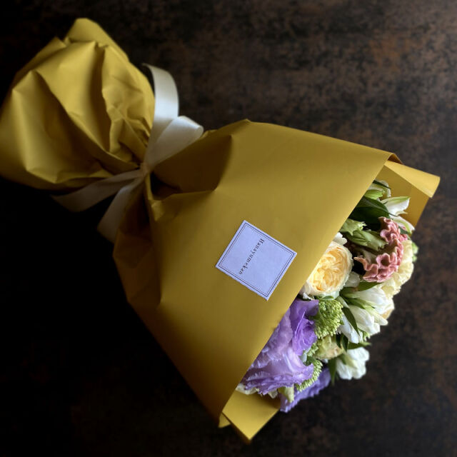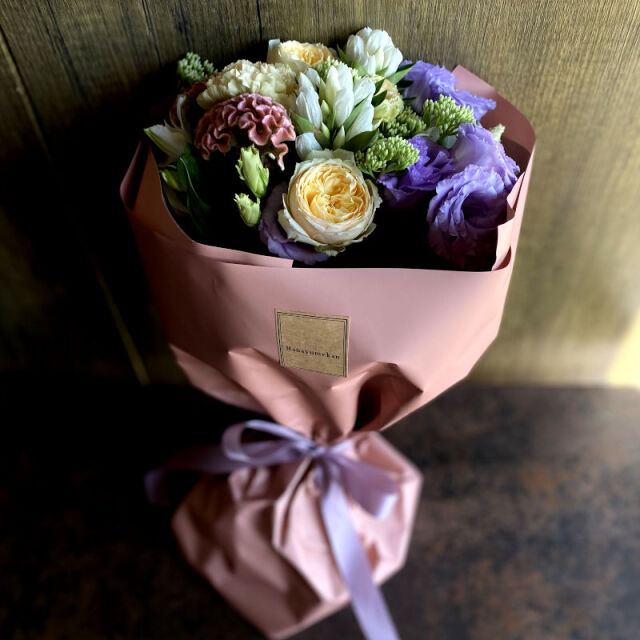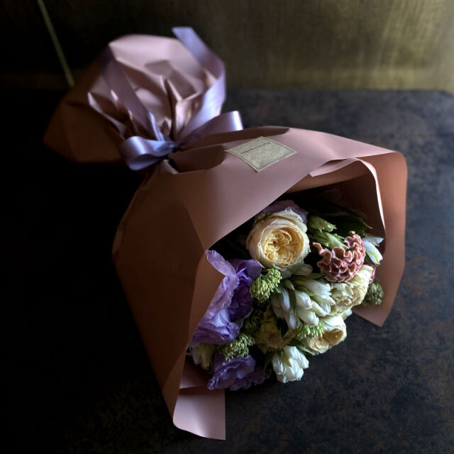 大人っぽいパステル系のお花とラッピング。