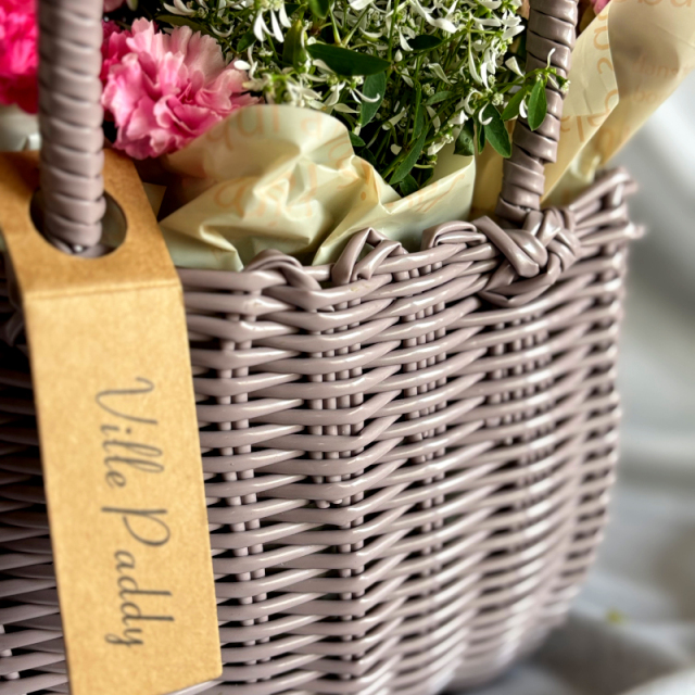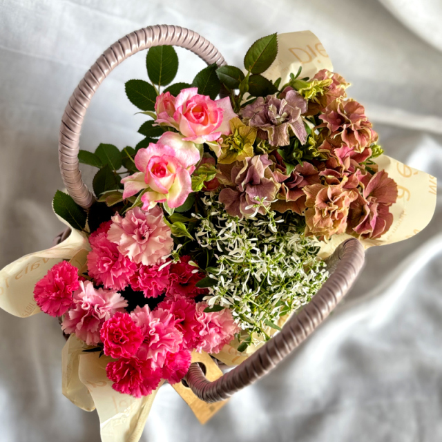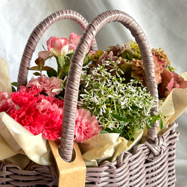 モカベージュのくすみカラーのカゴバッグに、ピンク系のお花を合わせて大人可愛い雰囲気になるように寄せ鉢をお作りします。