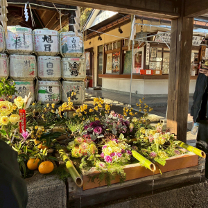 神社の手水舎には、正月のお花が飾られていて、
