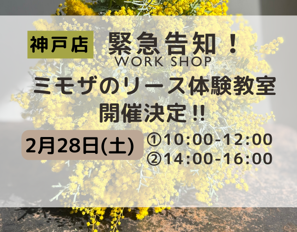 緊急告知! 神戸店 ミモザリースのワークショップ開催のお知らせ ありがとうございます。 満席となり受付終了いたしました。 【開催日】2月 …