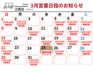 3月2日(月) 10:00~15:00 18:00~20:00 変則営業
