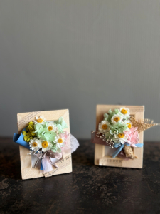 ご用意するドライフラワーをブーケに束ねていただき、お好きな和紙でラピングをしてフレームに取り付けていただく体験になります